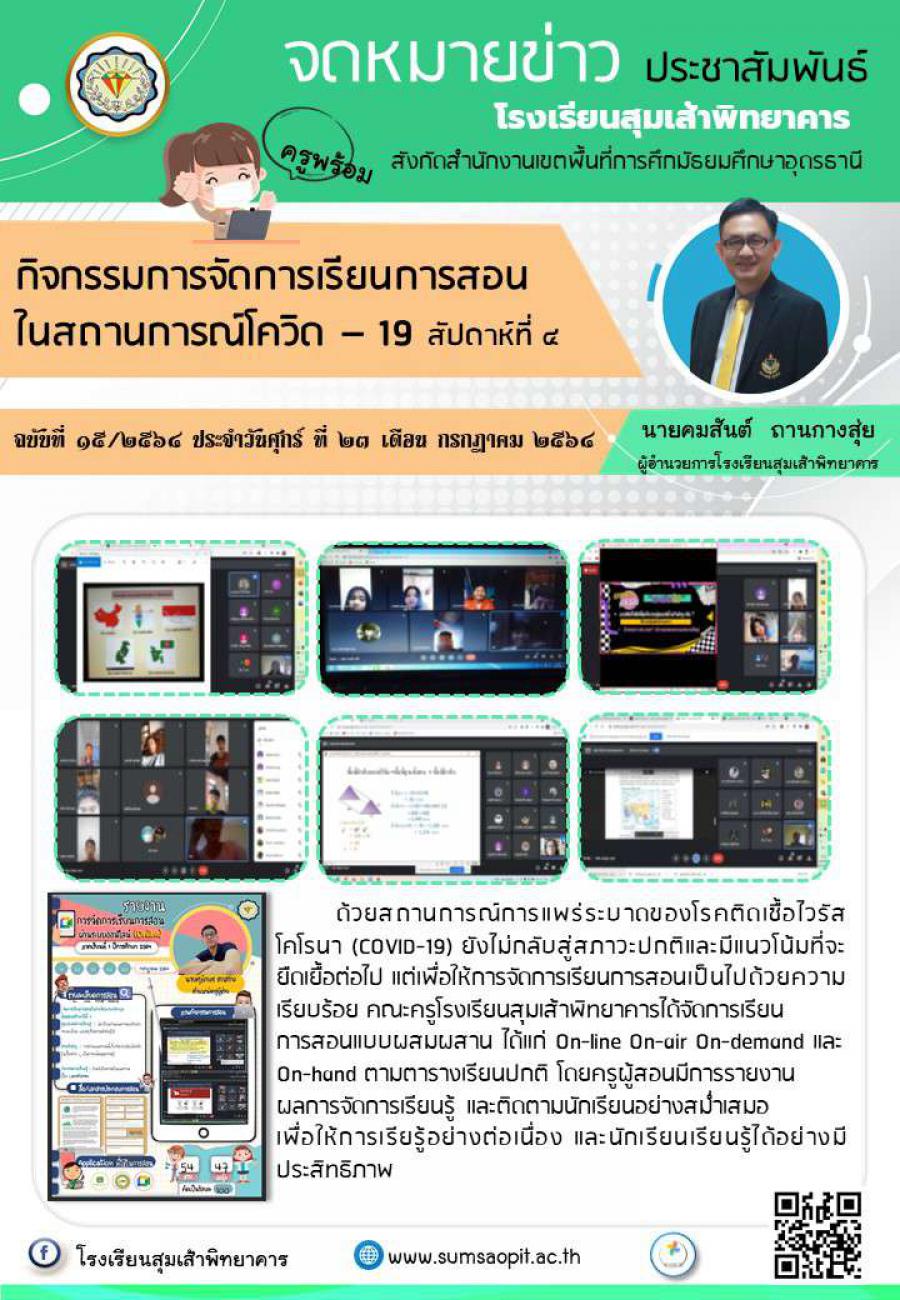 ด้วยสถานการณ์การแพร่ระบาดของโรคติดเชื้อไวรัสโคโรนา (COVID-19) ยังไม่กลับสู่สภาวะปกติและมีแนวโน้มที่จะยืดเยื้อต่อไป แต่เพื่อให้การจัดการเรียนการสอนเป็นไปด้วยความเรียบร้อย คณะครูโรงเรียนสุมเส้าพิทยาคารได้จัดการเรียนการสอนแบบผสมผสาน ได้แก่ On-line On-air On-demand และOn-hand ตามตารางเรียนปกติ โดยครูผู้สอนมีการรายงานผลการจัดการเรียนรู้ และติดตามนักเรียนอย่างสม่ำเสมอเพื่อให้การเรียรู้อย่างต่อเนื่อง และนักเรียนเรียนรู้ได้อย่างมีประสิทธิภาพ รูปภาพการจัดการเรียนการสอน